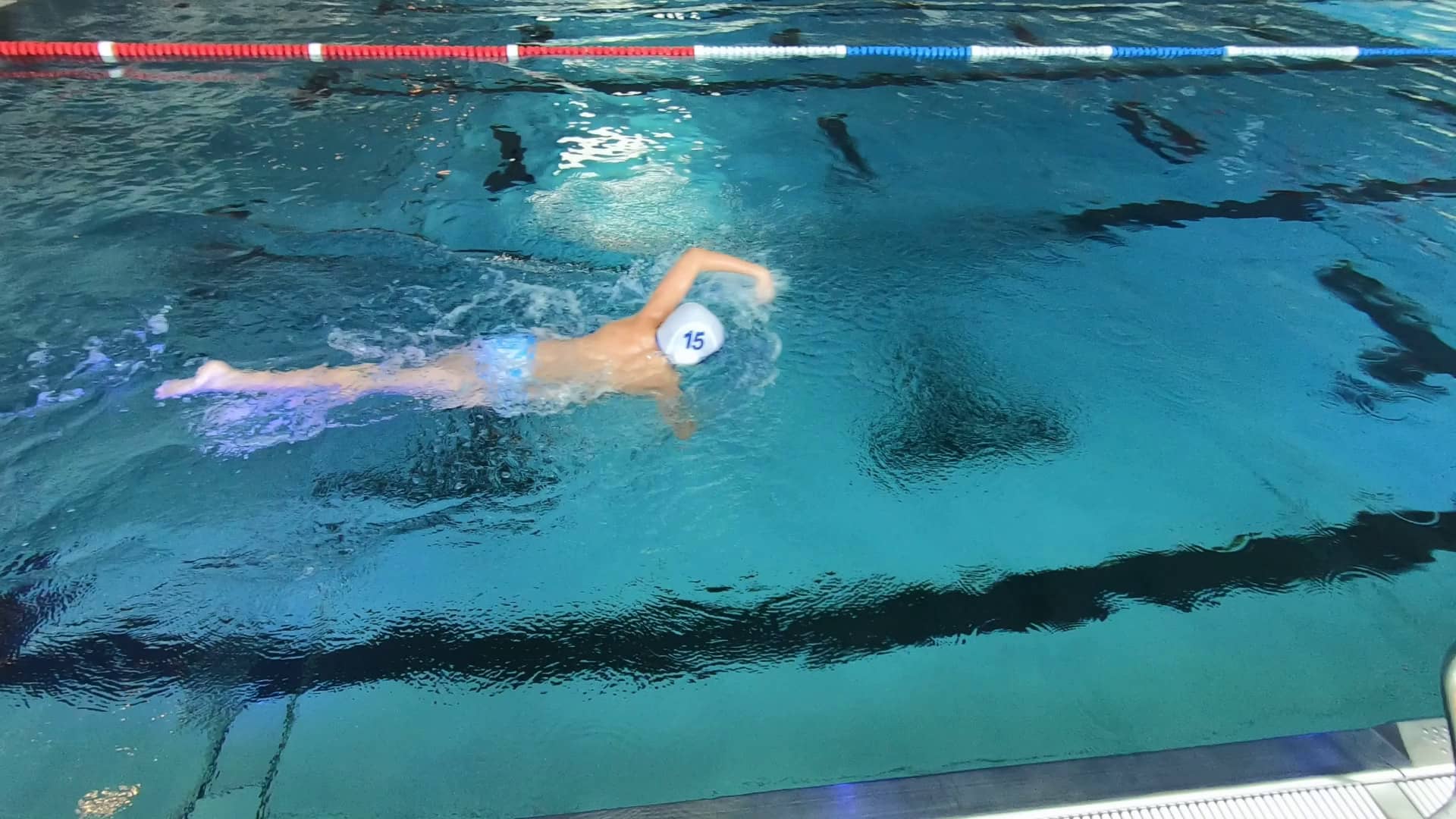 Description: Children swim freestyle and let the hand glide along the water surface before starting the arm pull.