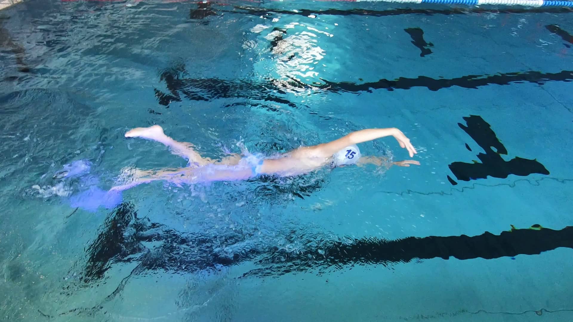 Description: Children swim using freestyle kicks. Each arm performs two strokes before switching.